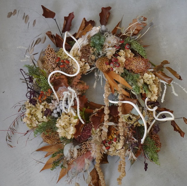 蔦をぐるぐる巻いて作ったリースの土台に、沢山の植物を巻き付けてお作りしたインパクトのある大きめのリースです。 ケイトウ・セルリア・グレビレアゴールド・フォルモーサ・石化ヤナギなど個性的な植物を沢山詰め込んでおり、 プリザーブドフラワーの葉とミックスしてお作りしているので、色持ちも良いリースとなっております。 店舗のディスプレイとしてや贈り物にもオススメです。 お正月の飾りとして飾るのもインパクトがあり良いかもしれません。 size 約 高さ65 cm × 横幅43 cm 奥行15cm ※到着後は直ぐにご開封をお願い致します。 ※ドライフラワーは湿気が多い所は避けて保管してください。 また光に長期間当たると色褪せが早くなり、痛みやすくなるので、日の当たらない所に飾ってください。