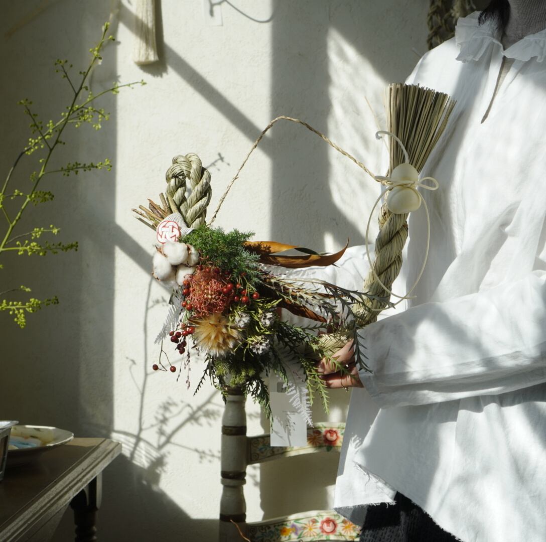 お花部分をワイヤーでしめ縄本体に付けていますので、お正月が明けましたら、後ろのワイヤーを外すと、お花部分をしめ縄本体から取り外す事ができます。