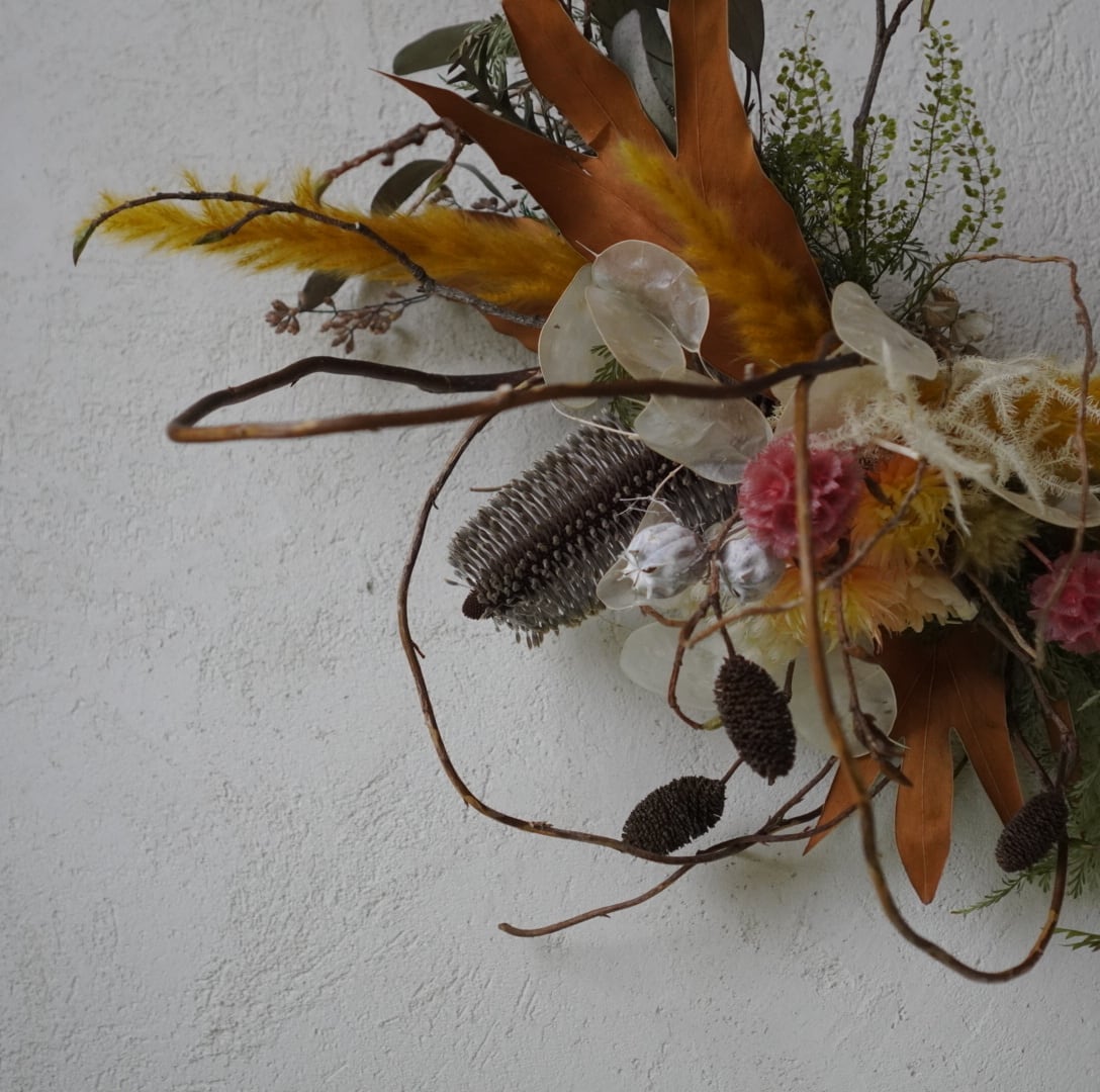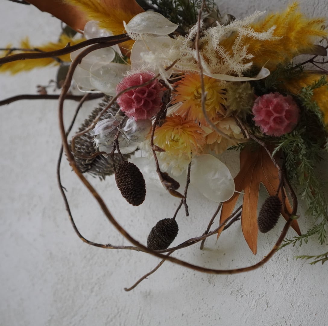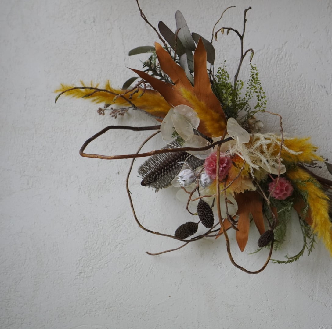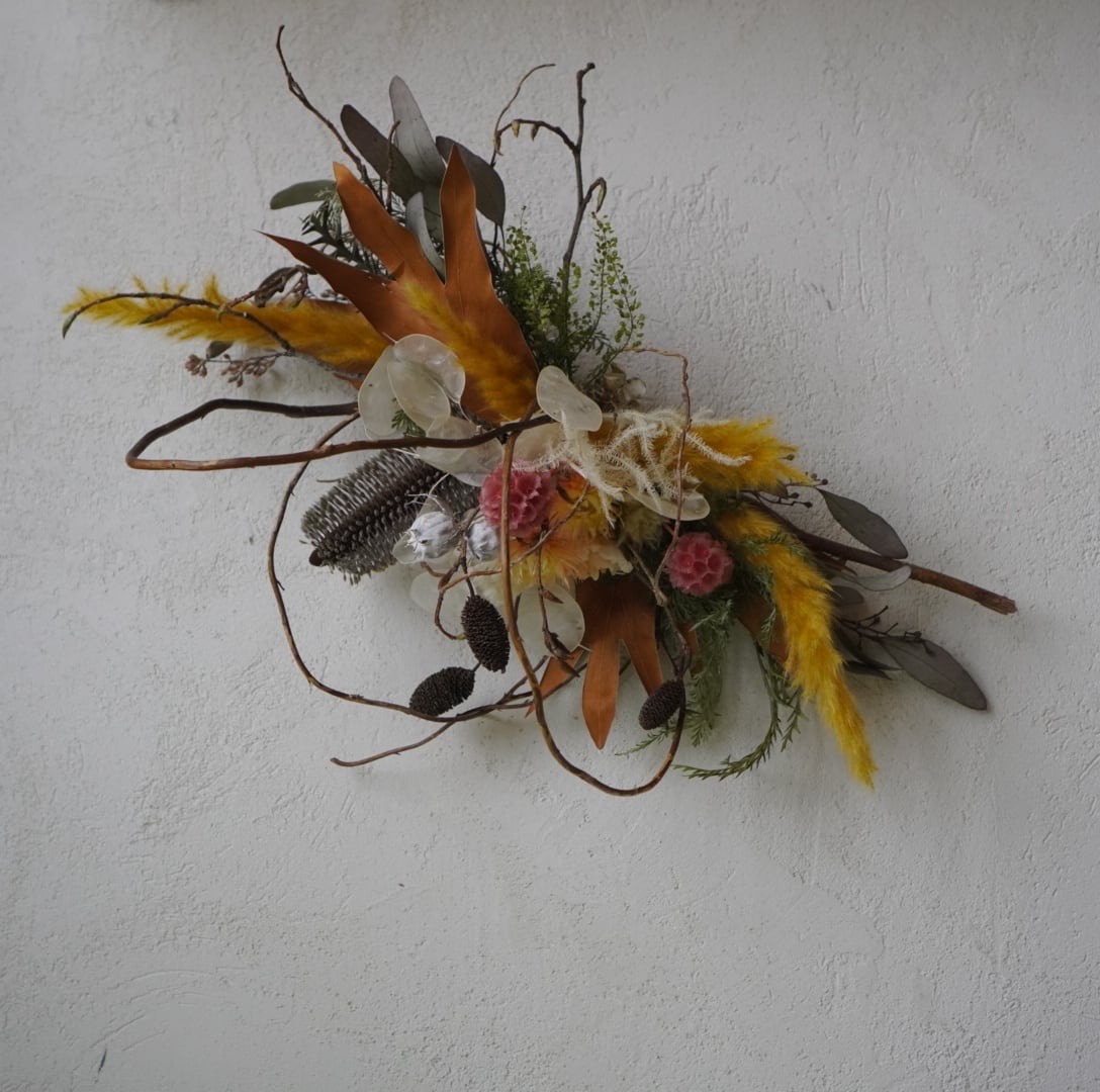 落ち着いたブラウンやくすみイエローを基調に、繊細な枝や実ものをバランスよく組み合わせ、空間にやさしい温もりと個性を添えます。