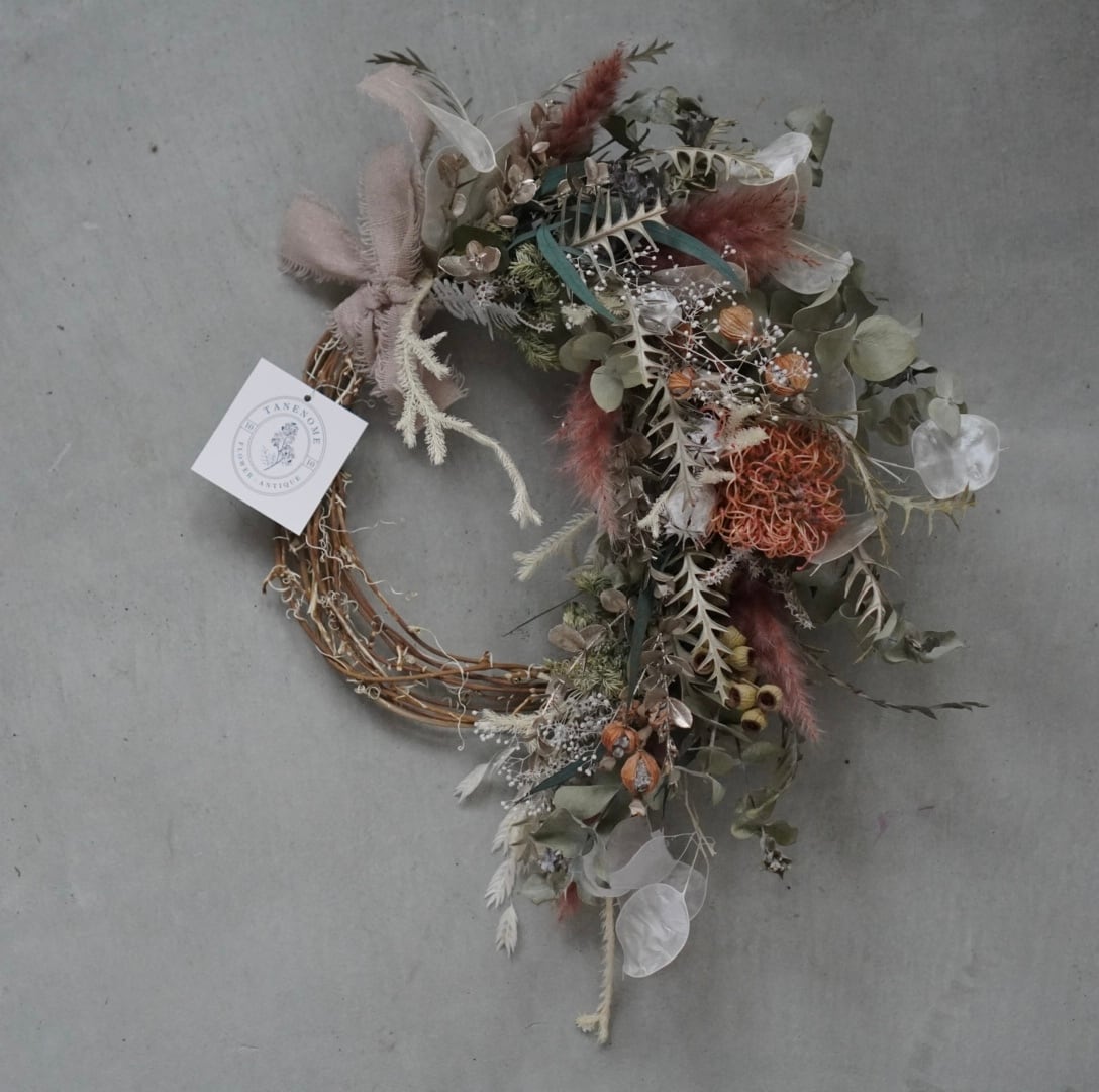ナチュラルな蔓のリースに、さまざまなドライ素材を贅沢にあしらった壁掛けリースです。