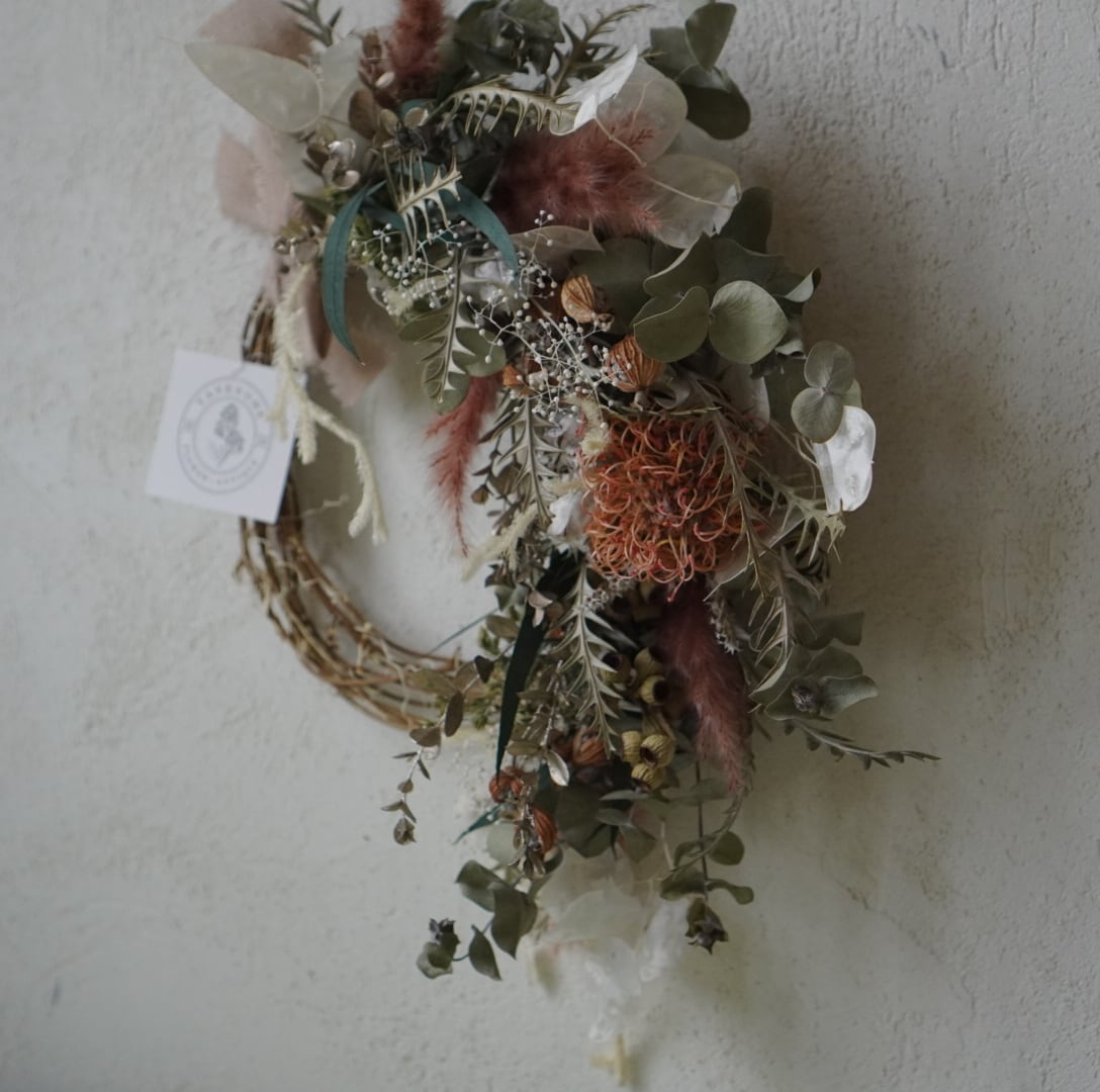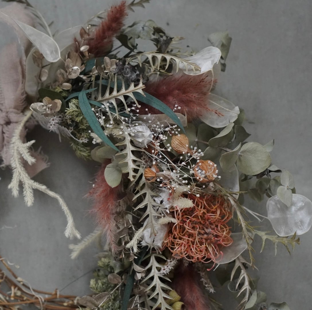 ドライフラワーの流れるアシンメトリーリース