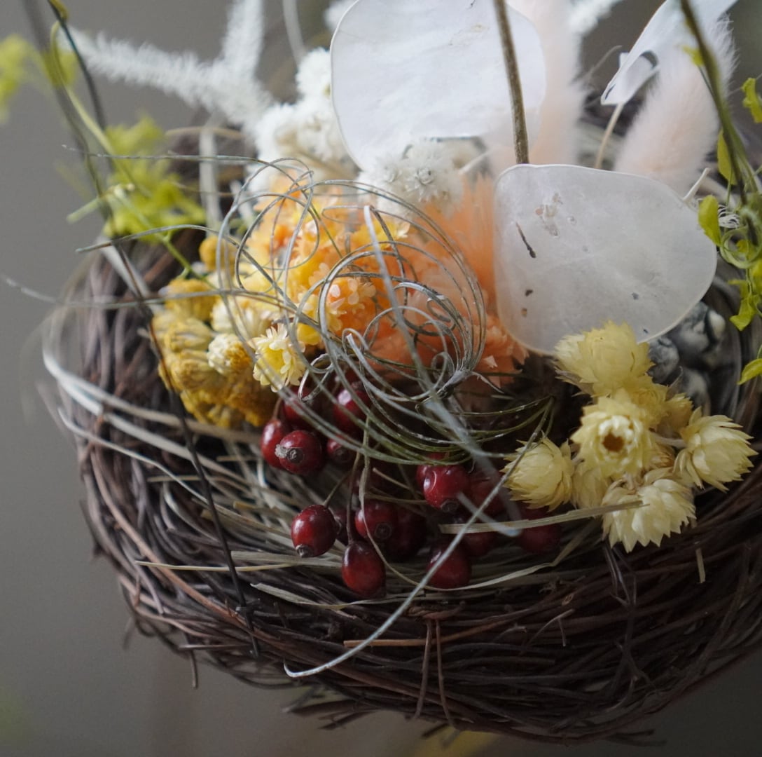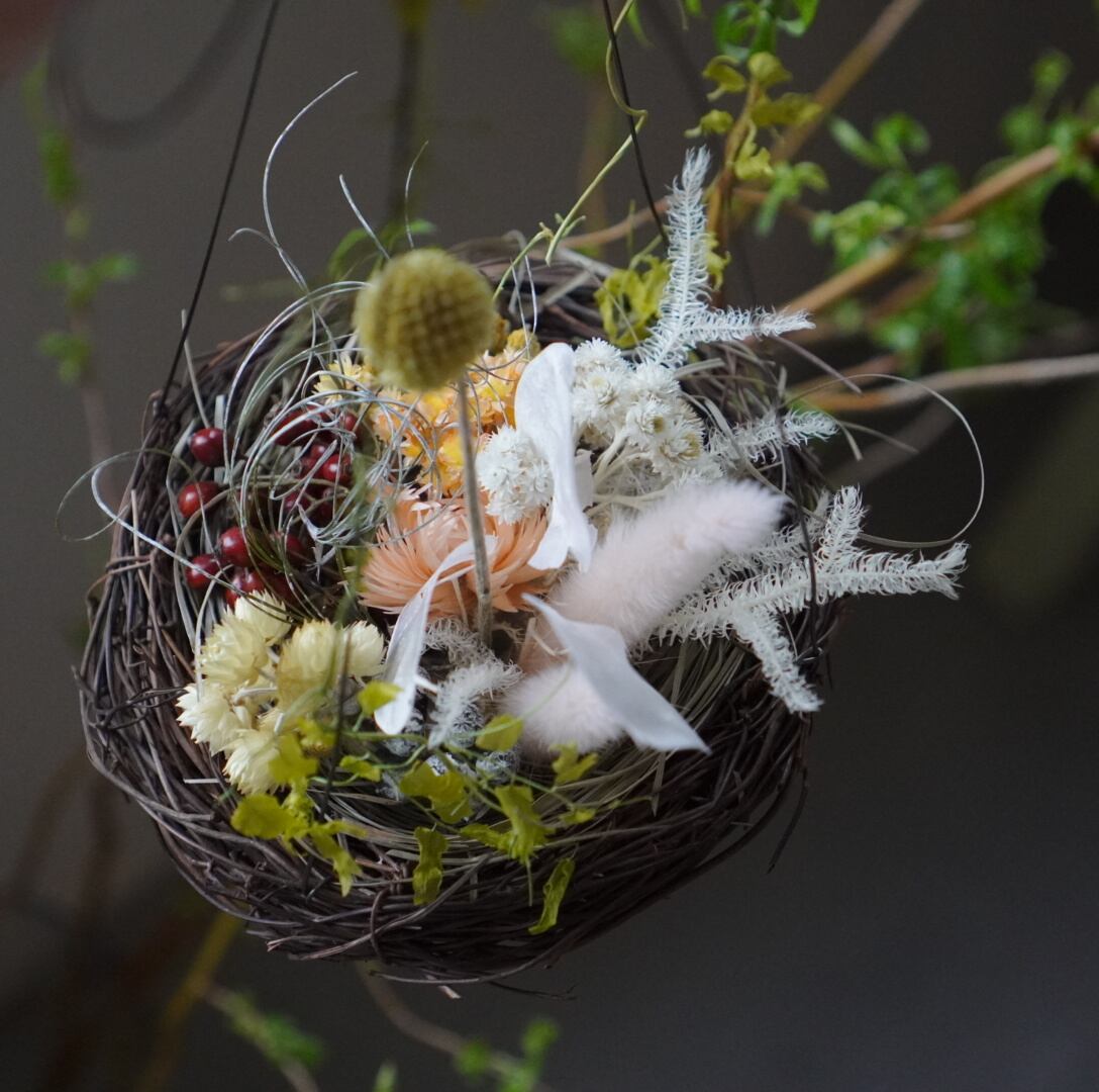 吊り下げタイプのドライフラワーオブジェです。