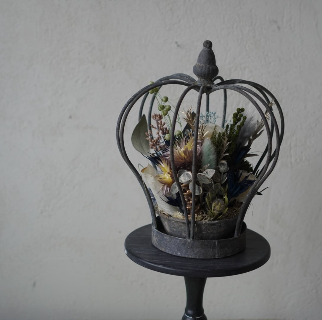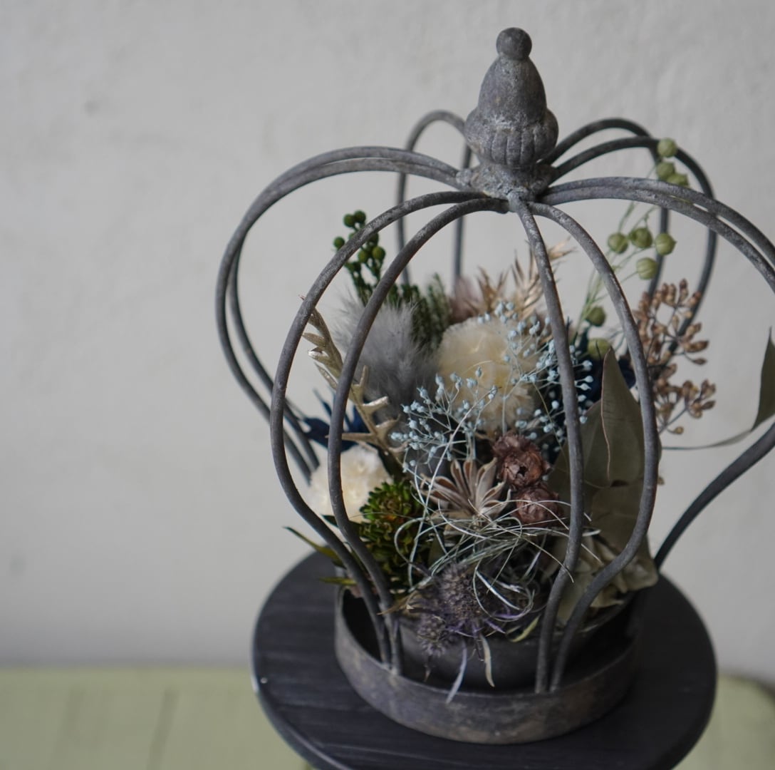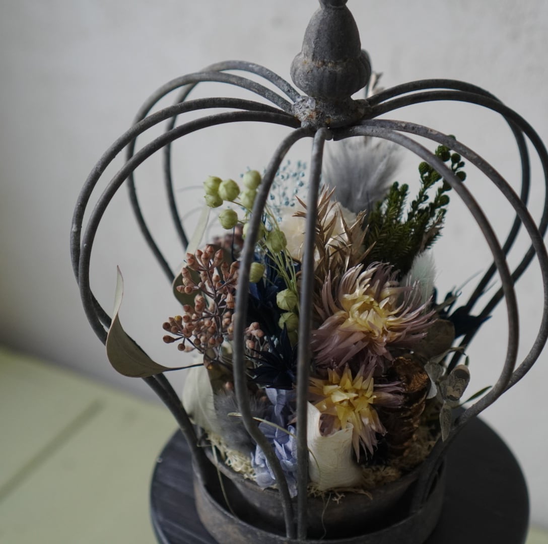 クラウン型の鳥カゴのようなアイアンのポットに、落ち着いたブルー×パープルのお花を詰め込みシックなアレンジメントをお作りしました。