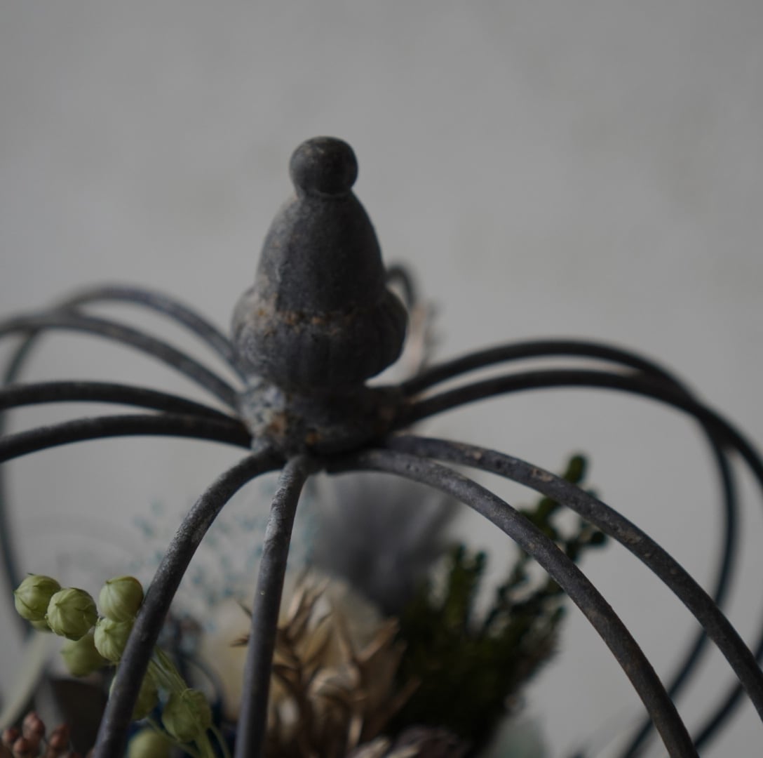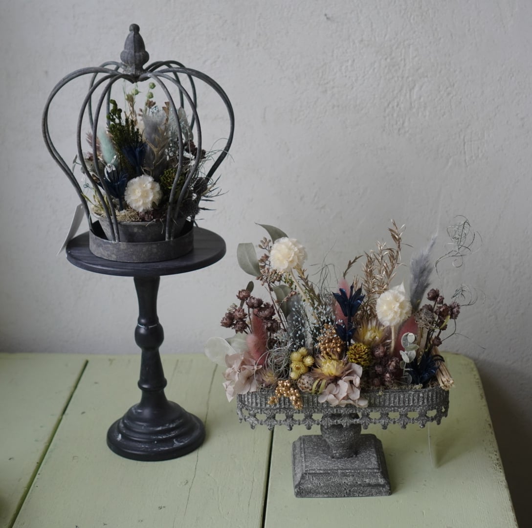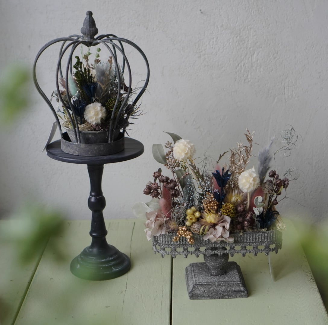 クラウン型の鳥カゴのようなアイアンのポットに、落ち着いたブルー×パープルのお花を詰め込みシックなアレンジメントをお作りしました。