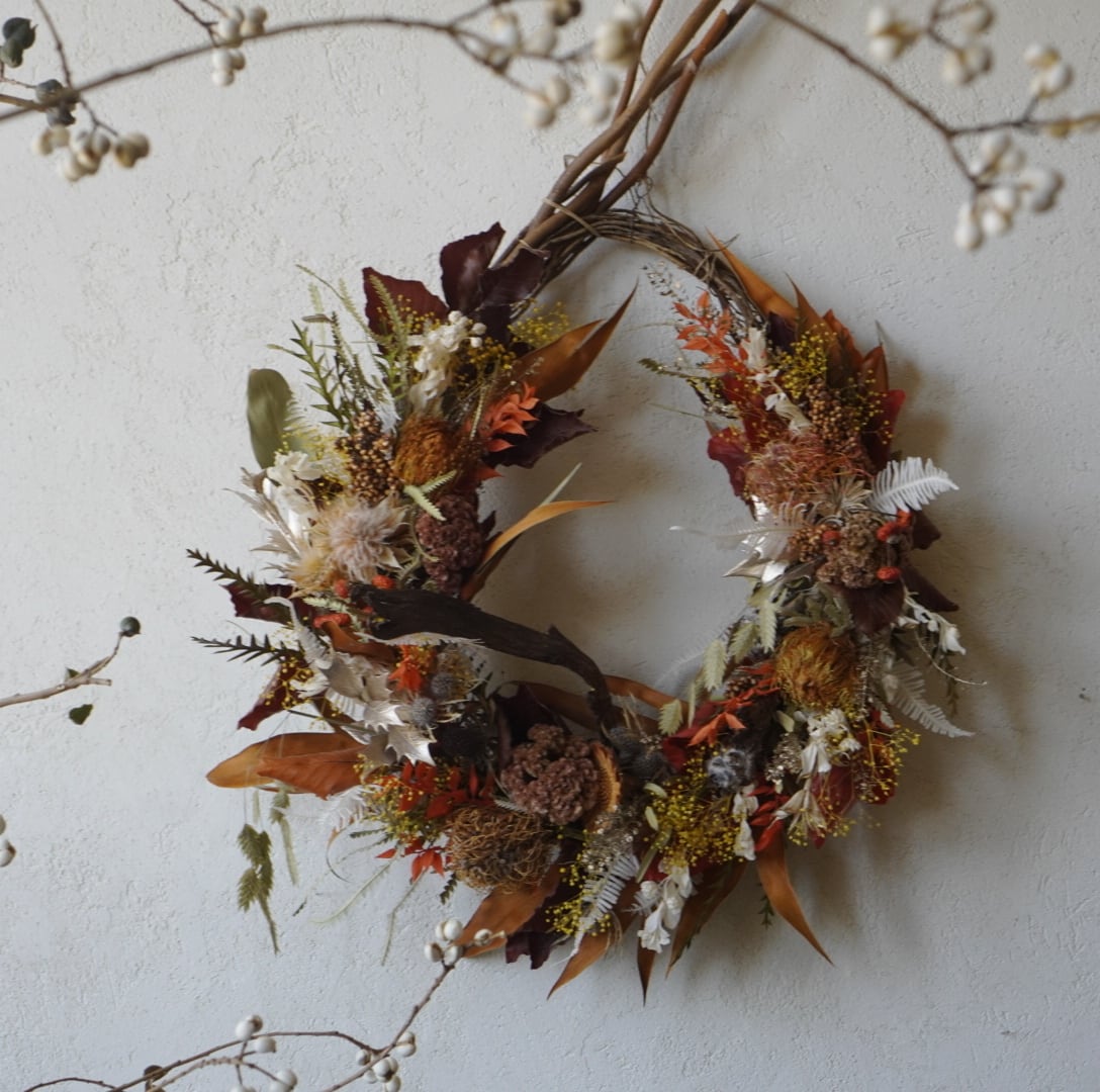 蔦をぐるぐる巻いて作ったリースの土台に、沢山の植物を巻き付けてお作りしたインパクトのある大きめのリースです。